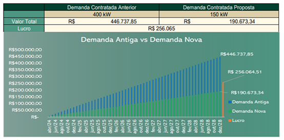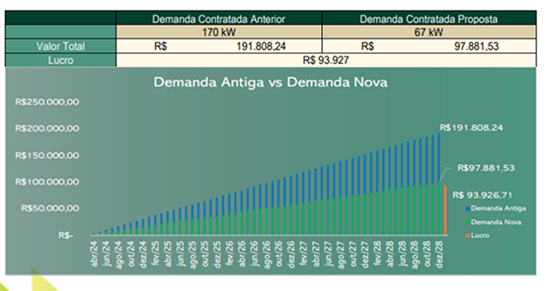 Fizemos o ajuste de demanda de energia elétrica, apresentando uma projeção expressiva de economia para diferentes setores do município. A estimativa foi calculada considerando o período do mandato da atual gestão, por isso projetada até 2028.